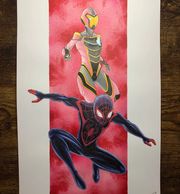 11 x 17 original art of Miles Morales Spider Man and Iron heart. Created on Canson Bristol Art Board with ink, copic markers, watercolor, and color pencil.
