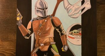 11x17 original fanart of The Mandalorian and Grogu from Star Wars. Created on an 11x17 Eon Comic Book Art Board with ink, copic markers, and color pencils.