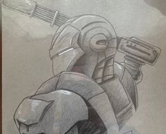 9x12 original art of War Machine created on gray toned paper with pencils and white charcoal.